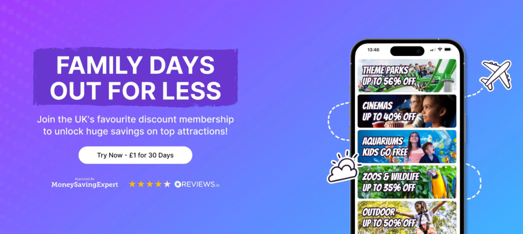 With this pass, we’ve visited top spots like zoos and aquariums at half price. The official site guarantees you up to 58% off tickets for hundreds of UK’s favourite sites. I saved over £70 just booking two Christmas attractions—seriously! Want the same deal? Try the VIP Pass for only £1 – 30 days trial now, risk-free.